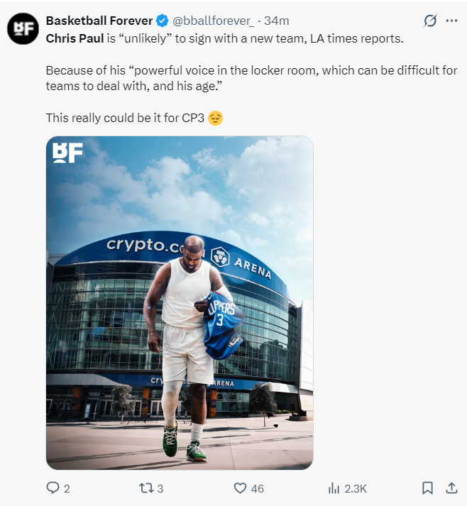根据《洛杉矶时报》的报道,克里斯-保罗不太可能被交易到新的球队,由于他在更衣室极具感染力的领导能力可能会给球队带来不小的困扰,加上保罗已经是一位40岁的老将,这或许就是保罗生涯的终点。
