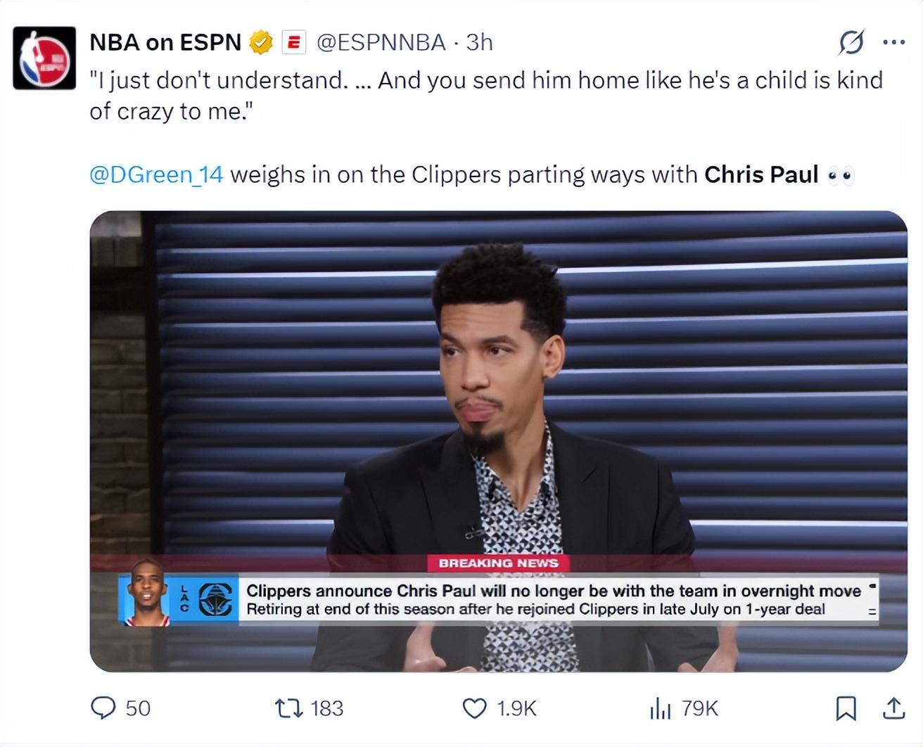前NBA球员丹尼-格林说道:我很不理解,快船将他遣送回家是什么意思,就好像40岁的保罗像个小孩子,在我看来这一切都荒诞了。